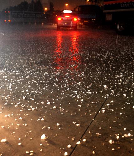 8月21日晚,沈阳街头的“冰雹”。当日18时30分,沈阳遭遇恶劣天气,大冰雹“突袭”降落。新华社记者 李钢 摄