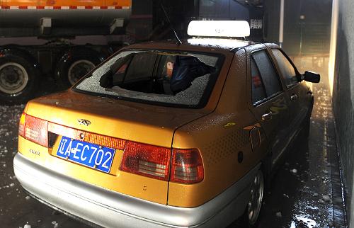 8月21日晚,沈阳街头一辆出租车的后挡风玻璃被冰雹击碎。新华社记者 李钢 摄