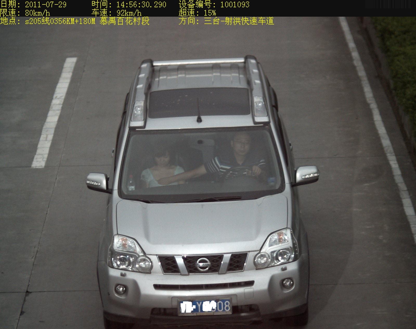照片拍摄时间为2011年7月29日14点56分30秒。拍摄地点为四川绵阳s205线0356km+180m路段,驶向三台一射洪快速车道。此路段限速80公里/小时,车速为92公里/小时,超速15%。