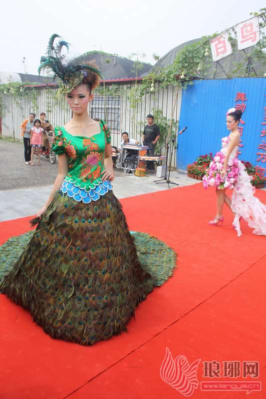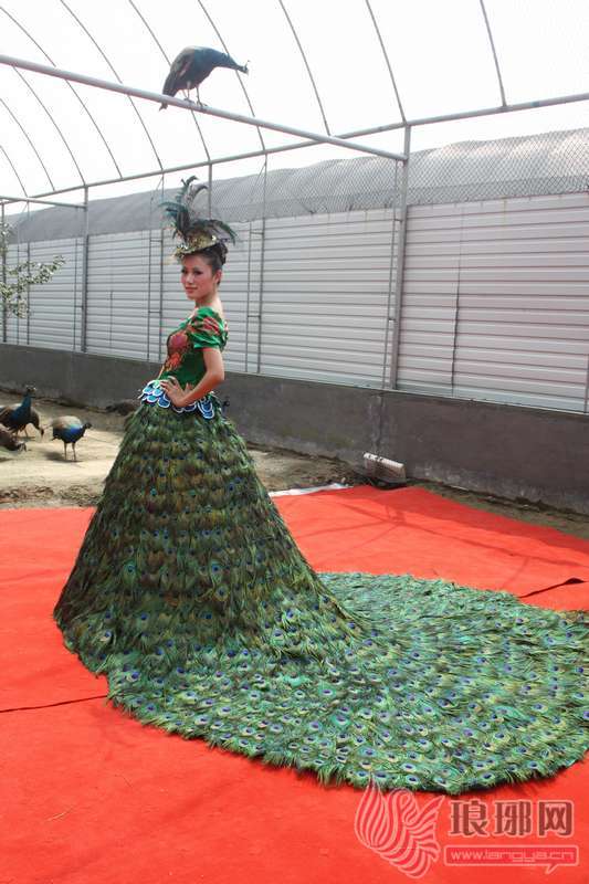 据此孔雀养殖基地的负责人邱先生介绍,此件婚纱是他委托某婚纱公司制作的。工作人员历时2个月,用3150根孔雀羽毛一针一线制作而成。上身是刺有苏州刺绣的紧身衣服,下身则全部由孔雀羽毛构成。