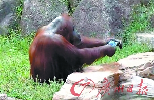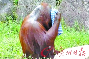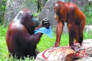 这只猩猩很为自己的“创意”得意,一只小猩猩也想借毛巾一用,却被它一把推开。小猩猩似乎很羡慕毛巾的用处,在一旁不断乞求。有目睹了此段情景的游客说:“这可比《人猿星球》有意思多了。” (中新)