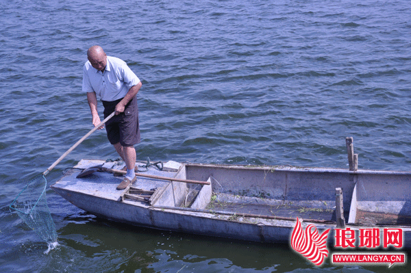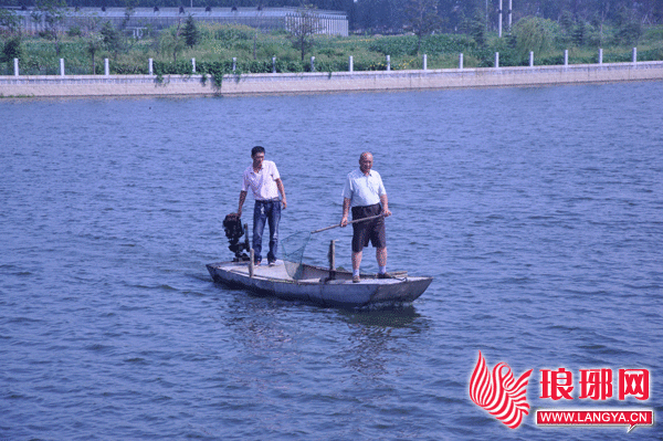 综合治理后的苍源河水质清澈,波光粼粼。临沭县郑山街道北沟头村支书李守鹏利用苍源河橡胶坝内蓄水充足的便利条件,去年8月投放了2万斤花鲢鱼苗和白鲢鱼苗,干起了养鱼的营生。“养殖白鲢和花鲢不用花钱买饲料,割些青草投入到水中就行了,还能起到净化水的作用。”李守鹏介绍说,橡胶坝管理员老李和表弟帮忙照看,打捞水面漂浮物,维护水域清洁。前些日子由于鱼苗太厚,卖了万多斤花白鲢,一次收获了4万元。下一步打算在中秋节前再上市一批,获取更高的节日经济效益。图为橡胶坝管理员巡逻捞取水面漂浮物。