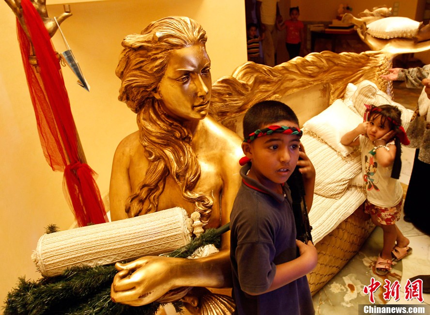 8月26日,拍摄于卡扎菲女儿阿伊莎住宅内的镀金沙发,沙发一头是阿伊莎的头像,造型就像一条美人鱼。阿伊莎的头像还出现在很多其它房间内。