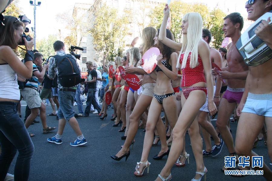 8月27日,在乌克兰首都基辅,乌克兰内衣模特在街头游行。
