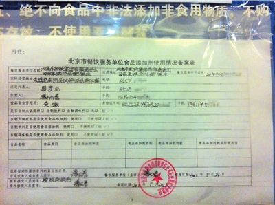 东来顺华龙街店的食品添加剂使用情况备案表显示,其自制饮料不使用添加剂。本报记者张沫摄
