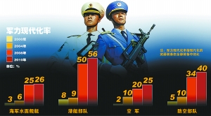 2000年—2010年中国海空军力现代化率提高示意图。 CFP/图