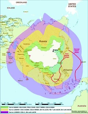 黄色区域:中国周边2000公里范围内,有CSS—5(东风—21D)反航母弹道导弹、CSS—5(东风—21C)中程弹道导弹、DH—10(东海—10)远程对地攻击巡航导弹、携带反舰导弹的“飞豹”—7歼轰机和B—6轰炸机。