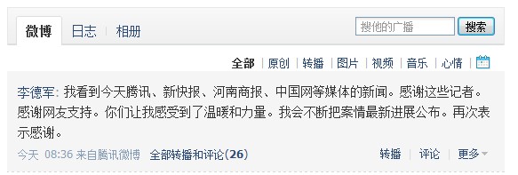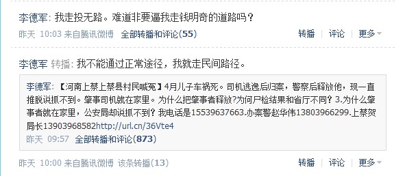 随后,一个头像为白底的黑色“冤”字,注册名为“李德军”的微博出炉了。在现实中的李德军赶住上蔡县法院的路上,网络“李德军”已经备受关注。