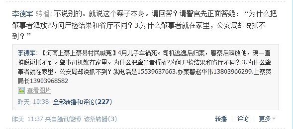 @“英雄本色”:尊敬的广大网民朋友,有关李德军的儿子被车撞死的事,在微博上发表的很多内容都不属实,纯属歪曲事实,欺骗网民的感情。案发后刑警大队努力查清了案件的事实,其中的一名犯罪嫌疑人已经起诉到法院,另一名犯罪嫌疑人也在积极努力追捕中,而且公安机关还在协调嫌疑人家属对李得(德)军积极赔偿。