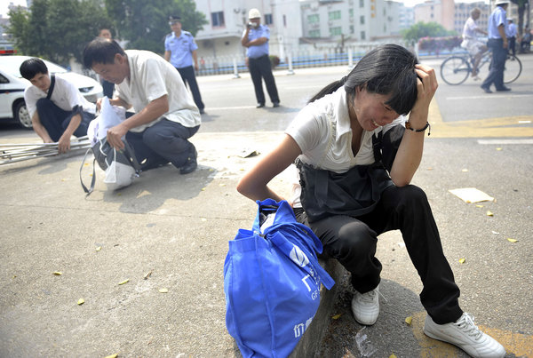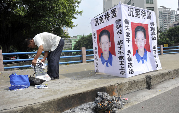 2011年8月30日,广州,开学的日子,小黄的家人在路边为他烧纸钱。1年前,儿子在上学路上被一辆套牌奔驰车撞死。目击者称肇事司机是名女子,但交警却称是名男子。庭审时,交警反驳家属称,“家属如果阻止小孩上学就不会被撞死。”向南/CFP