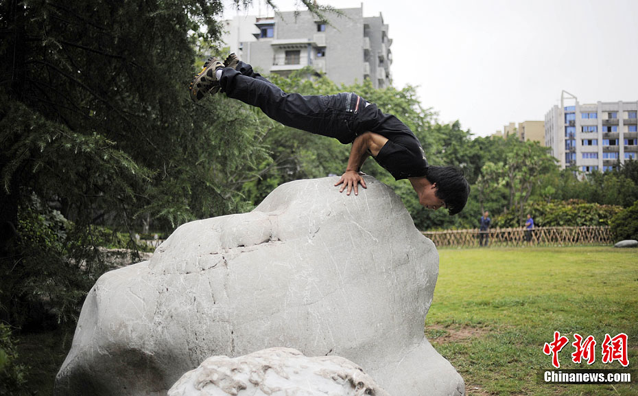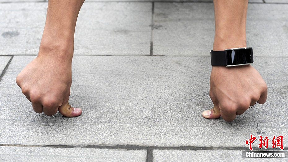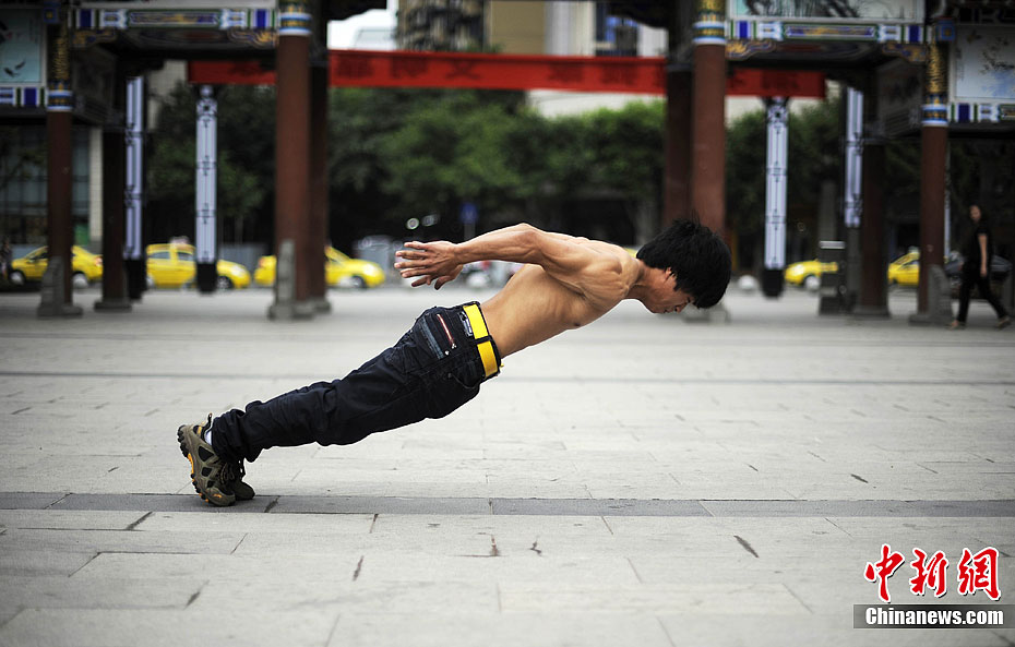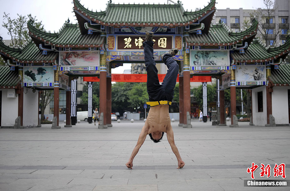9月7日,重庆渝北区碧津公园里,市民见证了小何不借助任何外物支撑、用两根大拇指撑地把身体笔直倒立“栽”在地面上的绝活。起初,他躬身弯腰,伸出大拇指在地面试着下压数次,然后,他把双手大拇指接触地面的宽度,调整成比双肩约宽20厘米,最后,他脚尖发力,双腿和腰缓缓离地,身体倒立起来。有市民看到这一幕,不禁啧啧称奇。图为2011年9月7日,重庆渝北区小伙何满堂向记者展示功夫。