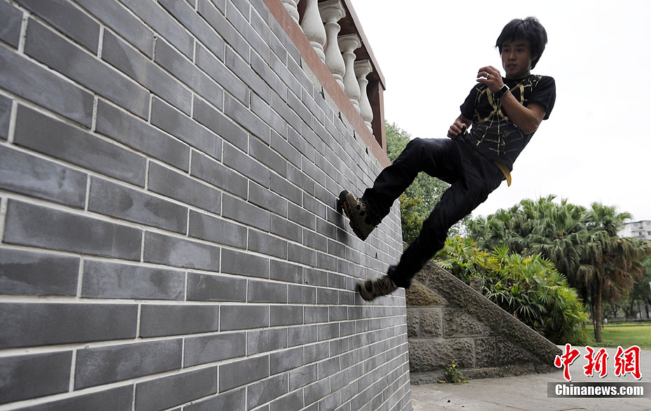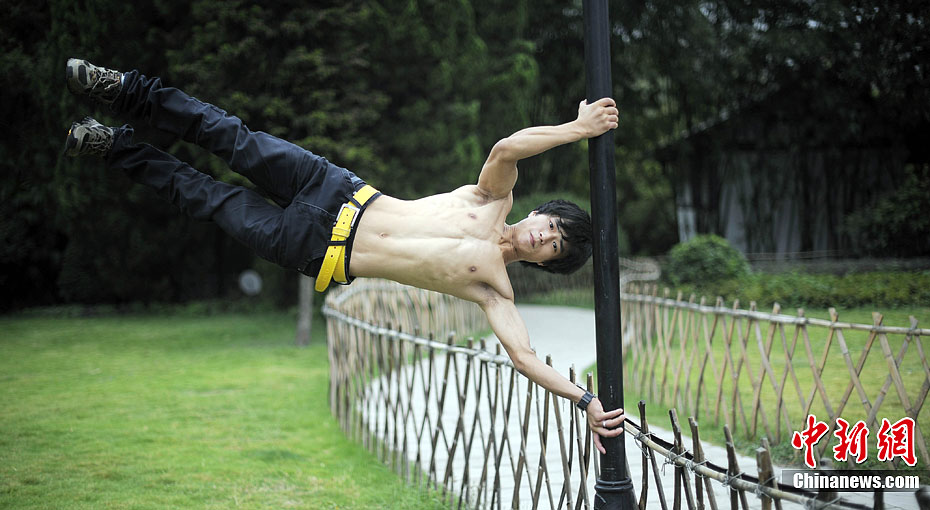 重庆男子练成“拇指禅” 灯杆上玩“漂浮”