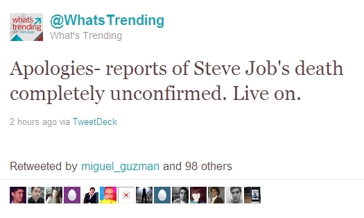 “当前趋势”在3点左右发布一条Twitter消息称:“有传言称史蒂夫·乔布斯已经去世。更多消息马上发布。”但是,该账号不久后即予以辟谣:“抱歉——有关史蒂夫·乔布斯死亡的传言完全未经证实。”