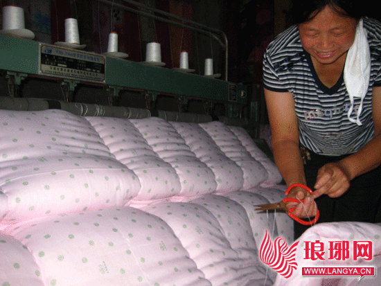 杜堂秋的媳妇李胜恒在使用缝被机加工棉被套。