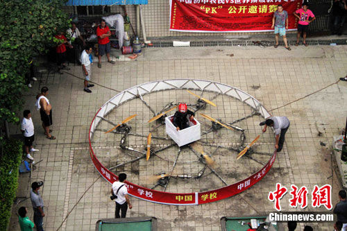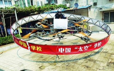 在舒满胜家3楼平台上,记者见到了这个最近风靡网络的自制“飞碟”。“飞碟”直径约4米,为圆形钢圈结构,圆盘内8个发动机成环形排列,每个发动机上各装一个螺旋桨。