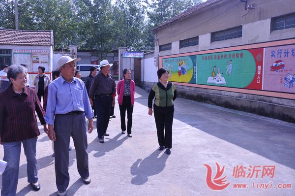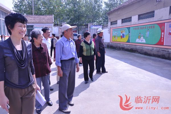 临沭县计生系统老干部在郑山街道姜屯村观看计划生育文化墙。