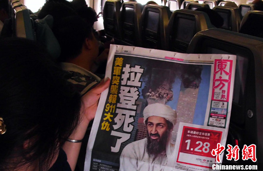 5月3日,世界各国传媒纷纷报道本·拉登被美军击毙的新闻。图为在马尼拉飞往香港的航班上乘客阅读有关本·拉登被美军击毙的新闻。中新社发 钱兴强 摄