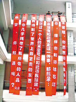 昨日,中南财经政法大学教学楼上演浪漫一幕:一位从该校毕业的男生,将同为校友的女友约回母校,在文波楼内挂起6条约10米长的大红条幅向她求婚,在微博上引发围观和争议。