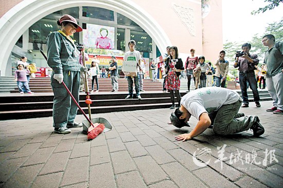 10月6日上午,来自湖南衡阳、岳阳的6名年轻人在广州天河购书中心门口,以用嘴巴捡垃圾、下跪膜拜环卫工人的方式宣传环保。负责人康毅介绍,10月1日,他们从湖南长沙出发,身上只带10元,沿途在株洲、衡阳、郴州、韶关等城市,以同样的方式宣传环保,已募捐600余元,广州是他们最后一站。