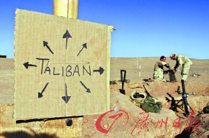 2001年12月1日,在阿富汗南部战斗的美军在前线装沙袋、部署打击阵地,旁边的纸板上标有打击塔利班的标识。而10年之后,阿富汗塔利班依然“无处不在”。 (资料照片)