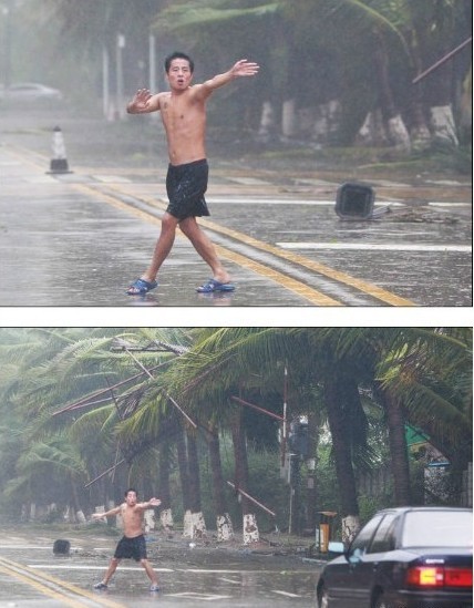9月29日23时,这条微博引起了众多网友的注意:“今天的海口,狂风暴雨,这位为了避免身后坍塌的建筑手脚架伤及车辆行人,这位小伙子脱光膀子跑到路中间,冒着暴雨,示意过往车辆与行人。在这种鬼天气里,小伙子长时间坚持在现场,逆风中大声向不知情的车辆呼喊与招手,让人倍受感动。”并配了两张“光膀哥”在风雨里招手示意车辆的图片。