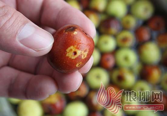 10日中午,记者见到了刘先生购买的青枣,这些青枣放了一天后,有多半已经发红,确有许多软软的烂斑,在刘先生的指点下,记者发现,有的烂斑上有黑色的小点点,类似针扎的痕迹。仔细尝过,这些枣确是皮甜肉涩。