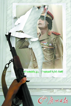 苏尔特街头,一位反卡士兵在卡扎菲画像前庆祝胜利。