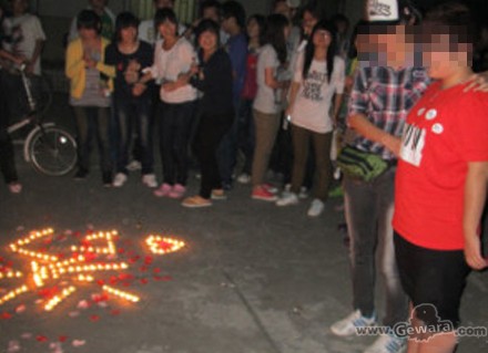 记者在论坛上联系到拍下求爱照片的发帖人,这位不愿透露姓名的同学告诉记者,此事发生于10月7日晚上10点多,学生纷纷从家里回到位于栖霞区的学校。当晚不少人去上了晚自习,就在大家下课后,一个其他校区的女学生来到他们校区,在女宿舍楼下用很多蜡烛摆下一个名字和一箭穿心的图案,旁边还撒了香气扑鼻的玫瑰花瓣。就在大家纷纷猜测可能是行为艺术时,忽然另一女同学从宿舍楼跑出来,并和之前的女同学抱在一起大胆热吻。大家这时才恍然大悟,原来自己经历了一个非同一般的求爱现场。众人都被浪漫的氛围感动了,纷纷鼓掌对两人表示祝贺,很多男生还说“女女求爱都这样浪漫,让我们男生情何以堪啊!”
