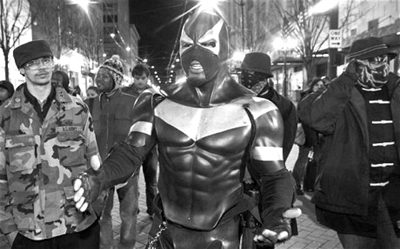 在美国西雅图,穿着钢筋铁甲、晚上走街串巷维护治安的男子凤凰·琼斯是很多人心目中的英雄,人称“凤凰侠”。不过最近他惹上了点小麻烦。由于使用胡椒喷雾阻止街头斗殴,琼斯反而因涉嫌“袭击罪”在9日被警方逮捕。他10日表示,仍然希望回到街头,继续对罪恶宣战。