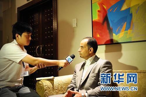 10月12日,利比亚执政当局官员穆罕默德· 泰纳兹(右)在接受新华社记者专访时说,卡扎菲儿子穆塔西姆在苏尔特被捕。新华社记者李木子摄