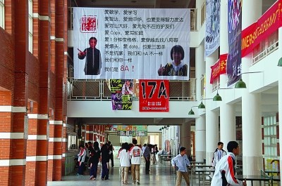 仙林外校中学部的学生自制的巨幅宣传海报。沈钧 宋国斌 摄