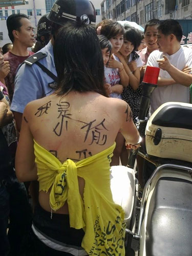 图片显示,一年轻女子上身衣衫不整破陋不堪,后背上被书写“我是小偷”等字样,周围聚集了大量群众围观,并且该女子身旁站有一名警察,但却无法看到其警号。