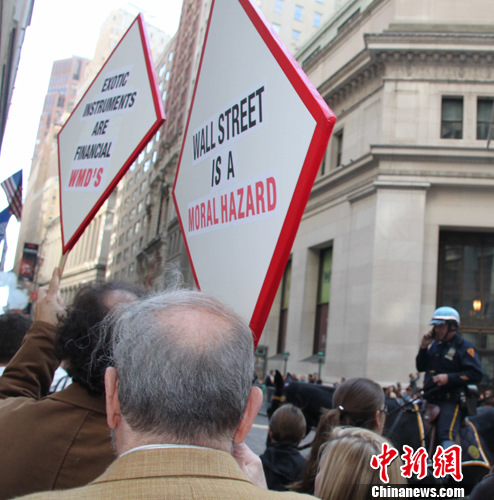 图为示威者当天举着各种反对华尔街的标语来到华尔街抗议,骑警在现场戒备。中新社发 李洋