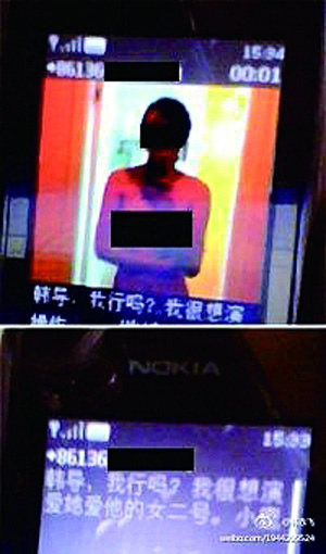 导演韩赤飞在微博中曝光一女演员发给自己的一张上半身裸露的彩信及求演其导演的电影女二号的短信:“韩导,我行吗?我很想演爱她爱他的女二号。”他解释出于不想伤害艺人的目的,对图片做了处理。他还表示对这种行为非常反感,绝不会和这样的演员合作。