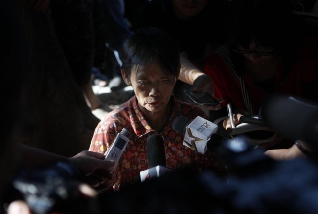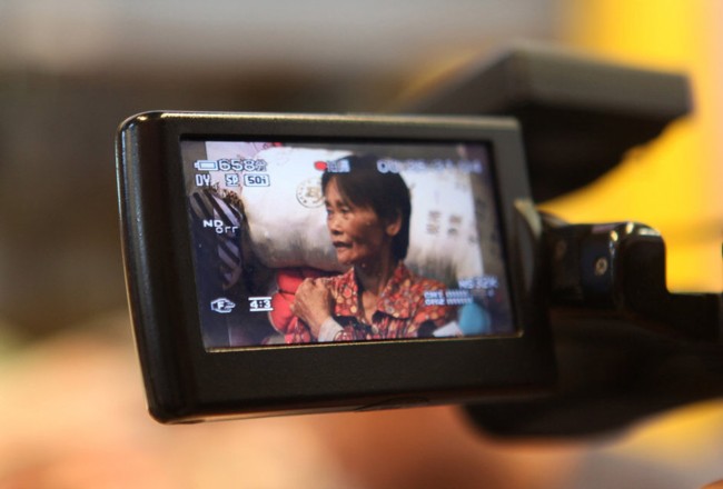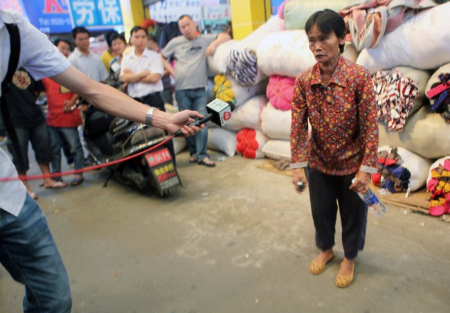 2011年10月17日,广东佛山,摄像记者身面对一米四几的陈贤妹,不得不向下倾斜镜头。