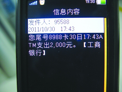 20多岁的张先生住在西站附近,因下午接到朋友电话喊他聚聚,到了傍晚5点多钟,他出了门,准备去超市买几瓶酒带过去,于是来到热河南路一家自助银行先取钱。张先生用的是一张尾号为8988的工商银行卡在该自助银行的ATM机上取钱。一番操作后,张先生取出了500元钱后,接着他接到了朋友催促他的电话,于是匆忙走出了自助服务区,并站在门外打电话。在打电话期间,张先生又收到两条短信。通话结束之后,张先生马上查阅短信内容,两条短信均显示为:“贵卡尾号8988,在ATM机支出人民币2000元,工商银行”,这两条短信都是在17点43分发来的。