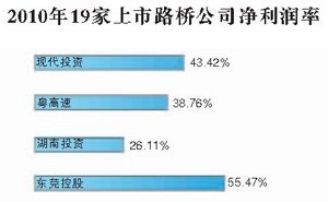 现代投资在19家路桥业上市公司中主营收入只居中游,19家高速公路上市公司的净利润率最低也接近20%(见右图)。