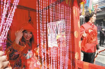 昨日中午12时,伴随着锣鼓声、鞭炮声和唢呐声,一队扭着秧歌、身着古装的人群簇拥着一顶火红的大花轿顺着河北路走向劈柴院。新郎身着大红色的唐装、脚踩千层底、手牵红布绸在轿子旁向邻居们挥手致意,新娘头戴凤冠、身穿霞帔、足踏绣鞋坐在轿子里捧着寓意平平安安的苹果,不时掀起红盖头打量周围,脸上洋溢着幸福的笑容。这个新郎名叫亚历山大,满头卷发,是一名意大利人,他要在劈柴院与自己的青岛新娘举行一场别开生面的中国传统婚礼。