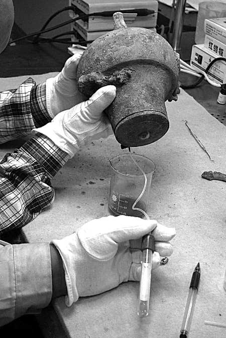 随后,该液体样品由省、市文物人员专程送往北京质谱中心进行权威鉴定。