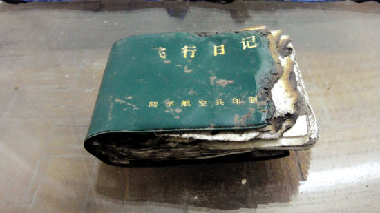 “我当时就叮嘱他们一定要多寻找纸质的物品。”樊建川说,金属类的残骸可以经历一些风雨,但是纸质的物件再也经不起风吹日晒了。三天三夜后,探险队员找到了邱光华的《飞行日记》。手掌大小,绿皮,已经被火烧得有些破损,封面签名已被雨水侵蚀,只能看见模糊字迹。