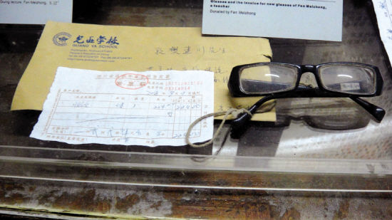 在众多的地震文物中,还有两件颇具争议的文物:“范跑跑”的一本教科书和一副眼镜。