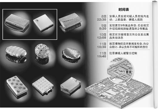 王夏虹表示,事发后最初盘点时,发现包括金嵌钻石手袋、金錾花嵌钻石化妆盒、金嵌宝石化妆盒等9件展品被盗。不久后,故宫发现有2件藏品被遗落在外墙的墙脚处,不过均出现了损伤,其中一件是晚装包,另一件是卡地亚的化妆盒,后者损伤较大,盒子已经被打开,并已变形,里面的镜子已破碎。