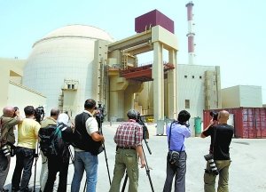多国记者在伊朗布什尔核电站反应堆外拍照。