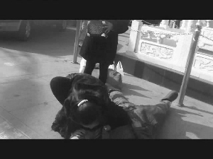 昨天中午,在贵友大厦门口趴活的司机周先生回忆,上午10点多,贵友大厦门口,一名穿着军大衣的乞丐走着走着,突然倒在了旗杆下。