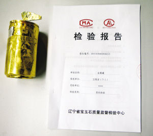 11月7日14时,本报记者将金罐送到了辽宁省宝玉石质量监督检验中心,当时经初步检验得出:罐体外层是金,但里面肯定不是金。另外,罐子称重结果为164.488克。