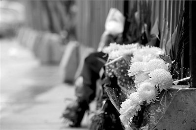 现场封锁线外摆放着菊花。