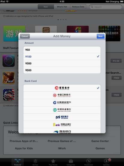 腾讯科技讯(娄池)11月18日早间消息,在经历了昨日的服务器升级风波后,苹果中国App Store应用商店周五凌晨更改了使用条款,正式以人民币标价结算。iPhone和iPad等移动终端已经开始支持国内各大银行充值,暂不支持银联和支付宝。
