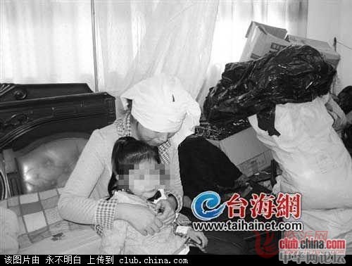 沈舜娜头裹着白布条,她紧紧搂着自己5岁的女儿,无助地哭泣。