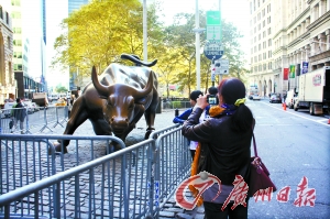 今日的华尔街,显然已没有了往日的霸气。被视为华尔街标志的铜牛也因为抗议者声势浩大而被铁护栏围了起来,过往游客也只能隔着护栏远远地拍照。