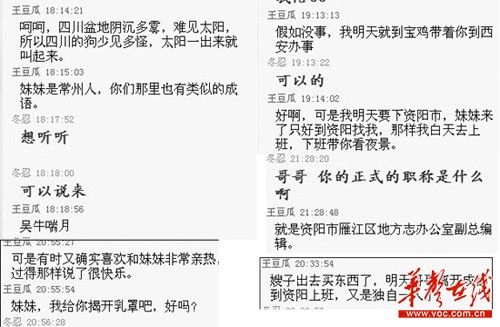 在“冬忍”的追问下,“王豆瓜”在聊天内容中自称名为王某,资阳市雁江区地方志办公室副总编辑。“冬忍”提出“能来见面么?”“王豆瓜”称,“明年春天哥哥有一次出差去北京、长春查资料的机会,那时路过大同市就可以看你。”随后,该帖内容被新浪微博和部分论坛转发,引起不少网友关注和讨论。“这哥们红了。”“同情!绝对是被一个男性小青年涮了啊!”同时,也有网友提出疑问:“对照一下上半身的夹克,不是同一人?”